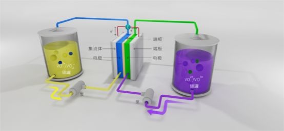 全钒液流电池(Vanadium Redox flow Battery,VRB),主要利用钒离子价态的变化来实现电能的储存和释放,其电能以化学能的方式存储在不同价态钒离子的硫酸溶液中,通过外接泵把电解液压入电堆,使其在对应的半电池闭合回路中循环流动,采用质子交换膜作为电池组的隔膜,电解质溶液平行流过电极表面并发生电化学反应,通过双电极板收集和传导电流,从而使得储存在溶液中的化学能转换成电能。