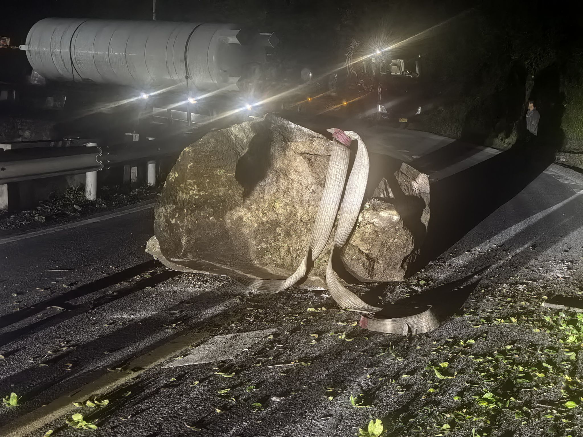 在供热锅炉及其配套设施和天然气站建设过程中,关键设备大件运输历经挑战。为将两台燃气锅炉及辅机、大型天然气储罐从江苏运至矿区,公司行政事务部协同地方交警、矿山分公司组建专项押运团队,历经三昼夜兼程、翻山越岭,全程紧盯路况与设备状态。9月30日凌晨3时许,车队行至华金公路十四公里处,突发山体滑坡,数吨巨石裹挟泥土砸落路面,与头车仅半米之隔,瞬间阻断通行!险情当前,押运组立即启动应急预案。矿山分公司保卫处迅速设置警示标识、疏导车辆,押运人员携带工具徒手清理碎石。因巨石体积过大,行政事务部现场负责人当机立断,紧急协调附近施工单位调派挖掘机支援。寒夜凛冽中,机械轰鸣声与铁锹撞击声交织,全员奋战近1小时,于凌晨4时抢通道路,锅炉和储罐运输车辆得以安全驶离险段,最终在清晨安全抵达矿区。这场惊心动魄的72小时险途押运,为锅炉安装投入使用和气站按期建成赢得宝贵时间。