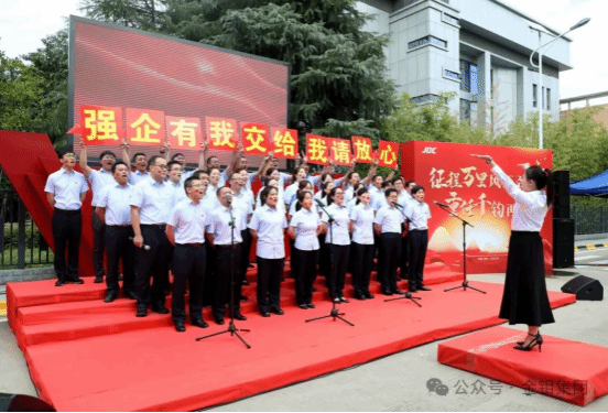 50余名职工身着“企业蓝”,整齐的队列、昂扬的姿态,将新时代产业工人的精神风貌定格成舞台焦点。随着指挥棒落下,《没有中国共产党就没有新中国》的旋律骤然响起,铿锵歌声里饱含对党的无限忠诚,唱出了新时代企业职工听党话、跟党走的坚定信念。一段穿越时空的对话串联起《我们走在大路上》的旋律,也唱出了金钼人接续奋斗的豪情。
