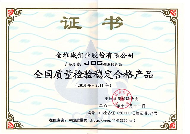 近日,从中国质量检验协会传来好消息,金钼股份JDC牌钼系列产品获得中国质量检验协会颁发的“全国质量检验稳定合格产品”证书。这意味着公司产品质量得到了国家级质量检验机构的认可和肯定。