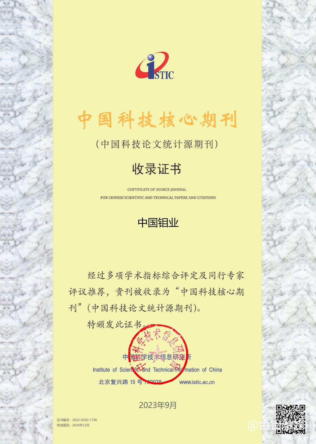 9月20日,由中国科学技术信息研究所主办的“中国科技论文统计结果发布会——暨中国一流科技论文世界影响力评价论坛会议”在北京召开,《中国钼业》继续入选“中国科技核心期刊”。这是自2011年以来,《中国钼业》连续12年被收录为“中国科技核心期刊”。